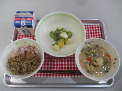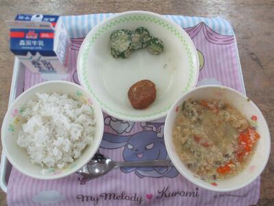 今日の給食は「古代米ごはん、お姫さん団子汁、手作りふりかけ、さいかなます」でした。月に1度の「ふるさとくまさんデー」今日の献立は、鹿本地方の郷土料理でした。ほかほかふっくらの団子は、子どもたちにも大人気でした。