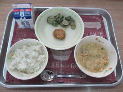今日の給食は「南関あげの玉子とじ、れんこんつくね、ごまキュウリ」でした。南関町の特産物である南関あげ。ふんわりした食感がたまらなく美味しい汁物になりました。