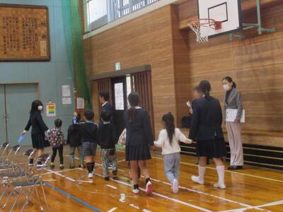 北風の寒い一日でしたが、午後から新1年生たちの就学時健診を開催し、高道小にたくさんの笑顔と笑い声が響きました。新1年生のお世話役をする5年生たちは、開会45分も前から体育館に来て、新1年生の到着を待ちました。わくわく張り切っているのが、こちらにも伝わりました。一人、また一人と次々に受付を済ませて入場。班ごとに並んだ新1年生たちを連れて、校内の各検査教室に向かいました。しっかりと5年生たちについて行って、立派でしたね。