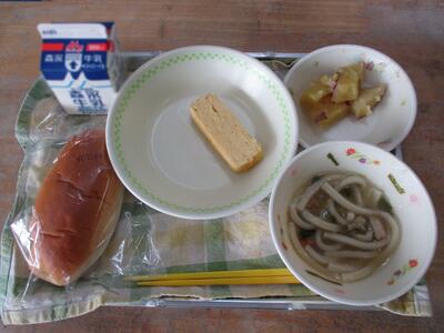 今日の給食は「ミルクパン、讃岐うどん、サツマイモとリンゴの重ね煮、厚焼き玉子」でした。重ね煮は、バターの風味が効いた甘いデザートです。先週のサツマイモは、みなさんどんな料理にしましたか?