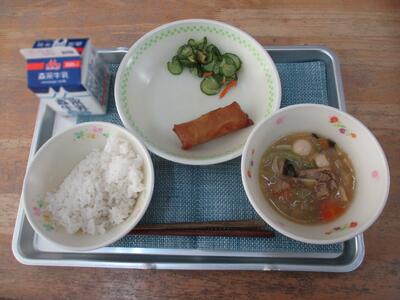 今日の給食は「八宝菜、春巻き、カリカリ和え」でした。野菜がたっぷり入った八宝菜。アツアツで届く汁物は、体がしっかりあたたまります。5年生は、今日はお弁当ですね。