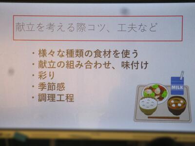 子どもたちが毎日食べている給食のことについてもっと深く知る・味わうことができる「PTA給食試食会」が開催されました。岱明町学校給食センターから緒方先生(岱明中在籍)に来ていただき、給食センターのことや給食ができるまでの過程についての説明、実際に作業をされている様子の動画を見せてもらいました。その後、参加された皆さんで協力して準備を行い試食開始です。