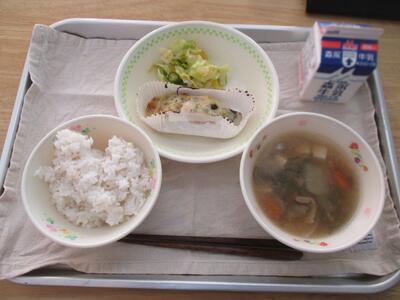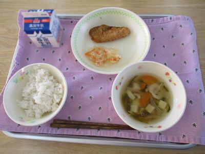 今日の給食のおかずは「アオサ汁、アジフライ、大根の柚子なます」でした。ビタミンやミネラルがたっぷりの汁物、食物繊維やビタミンCが豊富な大根と、風邪の予防にピッタリのメニューでした。