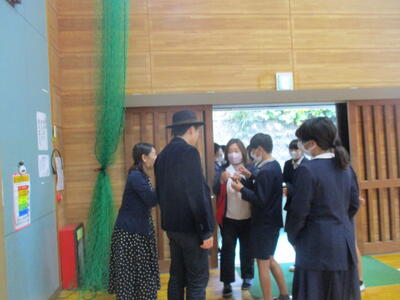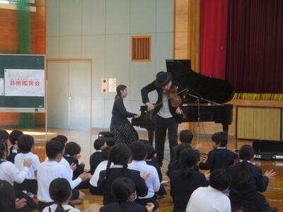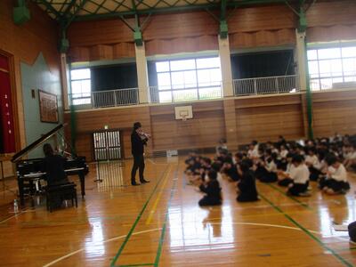 25日(火)は、年に1度の芸術鑑賞会でした。今回は、玉名市のアウトリーチ事業に申し込み、ОRANGE(おれんじ)のお二人に来ていただきました。ОRANGEさんは、ヴァイオリンとピアノの音楽デュオで、クラッシックからポップス、オリジナルの曲を披露してくださいました。目の前で奏でられるヴァイオリンとピアノの音色や演奏される姿に、子どもたちは瞬時に心を奪われ、体育館はまるでコンサート会場のよう。情熱大陸や鬼滅の刃、オリジナル曲の「おぼろ」等など、きっとお気に入りの曲があったと思います。本物に出会いふれあうステキな時間を過ごせました。最後にはサインもいただきました。ありがとうございました。