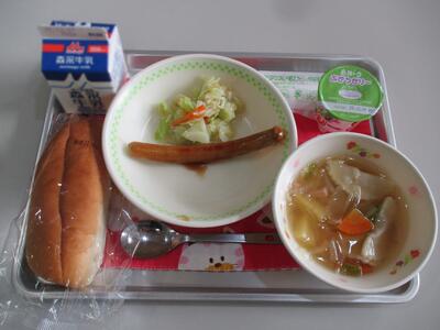 今日の給食は「ラビオリスープ、ウインナーのケチャップソーズ、キャベツのサラダ、ぶどうゼリー」でした。メニューに追加されたぶどうゼリー、6年生たちには金曜日に届けていただけるそうです。楽しみにしっかり静養してください。