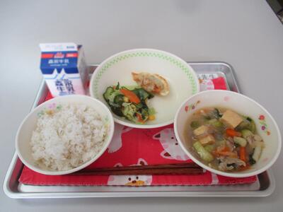 今日の給食は「ジャージャン豆腐、餃子、中華サラダ」でした。中華メニューのしっかりした味付けで、ごはんが進みました。ごちそうさまでした。