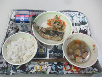 今日の給食は「鶏ごぼう汁、イワシの蒲焼風、もやしの三色和え」でした。開いたイワシは、ガブリと食べることができてとても美味しかったです。バランスのとれた和食メニュー、11月もごちそう様でした。