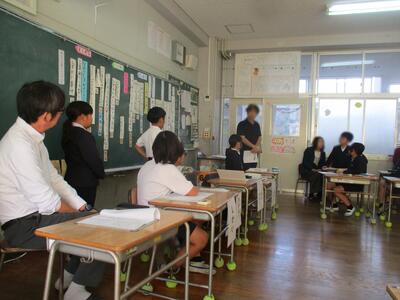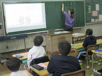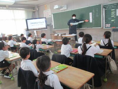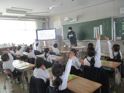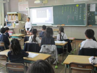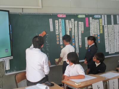 1年生教室からわいわい賑やかな声が聞こえてきます。国語の授業づくりを研究している荒平先生が、1年生にクイズを出されている真っ最中でした。「1まるい・2いつも動いている・3時間がわかるもの」と、3つのヒントで「時計」と自信満々に答えた1年生たち。自分たちでクイズを作ったり答えたりする学習をとおして、「話す・聞く」力を高めることが目標です。明日からクイズづくりが始まりますよ。楽しみですね。
