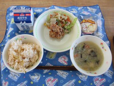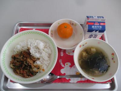 今日の給食は「わかめスープ、ビビンバ、みかん」でした。玉名の特産物の一つ、みかんが登場しました。ビタミンCたっぷりで風邪予防にぴったりです。
