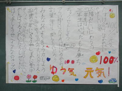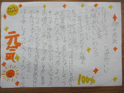 3年生たちの学級の歌が完成しました。先月、どの曲をもとに作るか、歌詞にどんな言葉を入れるか、歌を仕上げる時の役割分担をどうするか等々、学級会での話合いを重ねてきた3年生たち。歌詞についての話し合いは職員みんなで参観し、3年生たちの学級会の進め方を見て学びました。こんな言葉を歌詞に入れたいという自分の考えを理由もつけて発言する人。友達が意見を述べるときには静かに聴くことができる人。普段の授業や生活のなかで、共感力や考動力が育ってきたことを感じられる学級会でした。みんなで話し合えば、よりよい解決ができることをたくさん経験してほしいと思っています。学級のみんなが仲良く過ごせるために、この「100%元気」を歌い、互いの違いを認め、折り合いをつけながら考えて行動する3年生に成長してくれることでしょう。ますます楽しみです。
