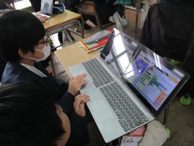 今日はICT支援員の鹿島先生の来校日。4年生たちは、タブレットでプログラミングに挑戦しました。自分が意図する活動を実現するために、どのような動きの組み合わせが必要か、どうすればよりよい解決策に近づくかを論理的に考える力をプログラミング的思考といいます。小学校のプログラミング学習では、物事を筋道立てて考え、試行錯誤しながら問題解決を図る能力を高めていきます。タブレットには、ゲーム的要素があり楽しく学べる素材が入っています。家に持ち帰ったときに、ぜひ試してみてください。