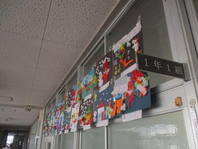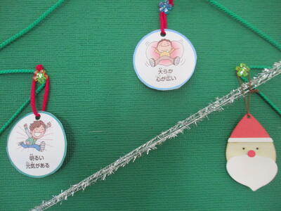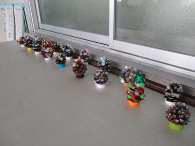 1年生教室前に、かわいいクリスマスツリーが並んでいます。よく見ると、松ぼっくりに飾りをつけたものです。その人、その人のアイデアが生かされたツリー。自然にあるものが一工夫でステキな飾りに変身しました。ぜひ、12日の授業参観で見てください。
