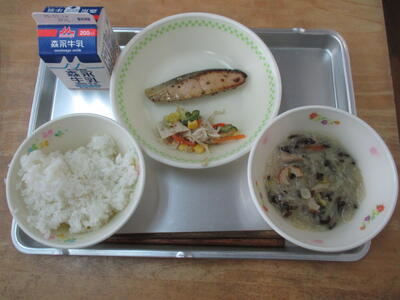 今日の給食は「ふしそうめん汁、鮭のハーブ焼き、豆腐と野菜の胡麻和え」でした。カルシウムたっぷりの鮭を、ハーブドレッシングで下味をつけて焼き上げてありました。こんがりとよい風味で、人気のメニューです。