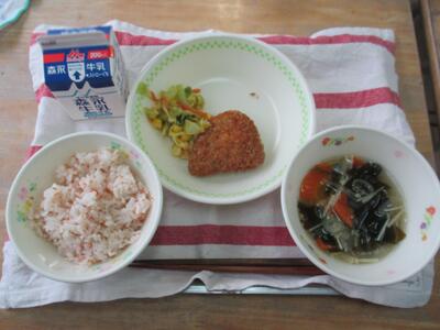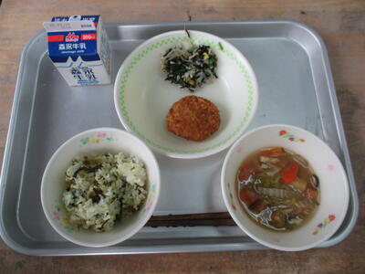 今日の給食のおかずは「茎わかめの味噌汁、ホキの南蛮漬け、キャベツのおかか和え」でした。茎わかめは、食物繊維が豊富で腸内環境を整えてくれるそうです。たっぷりの茎わかめ、初めて食べた人もいたかもしれませんね。