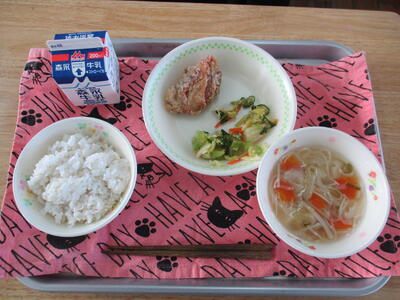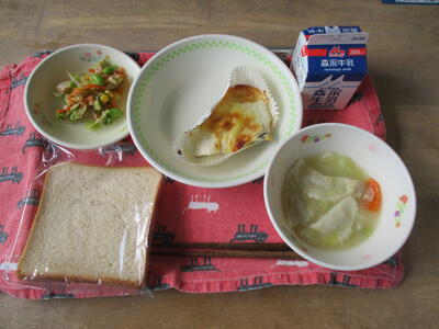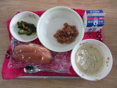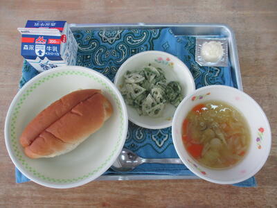 今日の給食は「ミルクパン、卵とトマトのポカポカ生姜スープ、ささみのレモン付漬け、マカロニサラダ」でした。体がじんわり温まるスープでした。給食センターの皆様、毎日美味しい給食をごちそうさまでした。