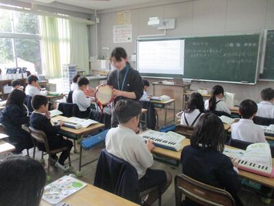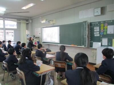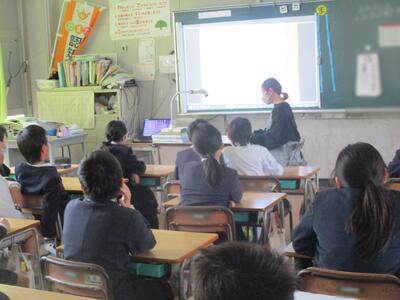 1,2年生にとっては、今日は楽しみな日だったでしょう。年に数回計画されているALTタビーナ先生との英語の学習の日です。タビーナ先生は、出身国アメリカのクリスマスの様子をたくさんの写真を見せながら英語で紹介してくださいました。(ここは、担任の先生の日本語訳付きです) クリスマスの飾りや遊び、食べ物など、日本のクリスマスとの違いに、子どもたちは食い入るように写真を見て、タビーナ先生のお話を聴いていました。外国の文化を知ることが、日本の文化を知ることにもつながるよい時間でした。タビーナ先生、サンキュー!