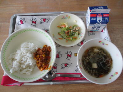 今日の給食のおかずは「もずくの味噌汁、そぼろ丼の具、もやしの彩和え」でした。甘辛いそぼろがかかったご飯は、何杯でも食べられそうなおいしさでした。色どりもきれいです。