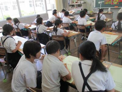 毎朝、朝の会の時間に各学年で今月の歌を歌います。6月の歌は「レッツゴー!いいことあるさ」♪ 心のきずなを深める月間にぴったりな歌詞です。3年教室では、子どもたが手をつなぎ、輪になって歌っいて、とても楽しそうでした。また、3,4時間目には、昨日小北先生に読み聞かせをしてもらったお話「じごくのそうべい」の心にのこった場面を絵に描いていました。西村推進員にもご協力いただき、地獄の鬼の姿をダイナミックに描こうとしていました。
