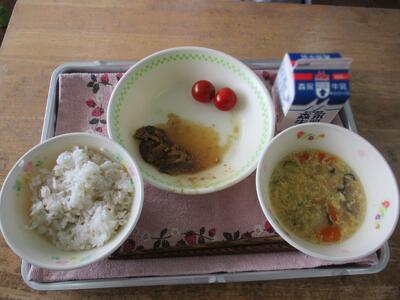 今日の給食のおかずは「南関あげの卵とじ、茄子のひこずり、ミニトマト」でした。ふるさとくまさんデー、南関あげに茄子、ミニトマト・・・今日はどの地域か、もうおわかりですね。玉名地域でした。生産者のみなさん、ごちそうさまでした。