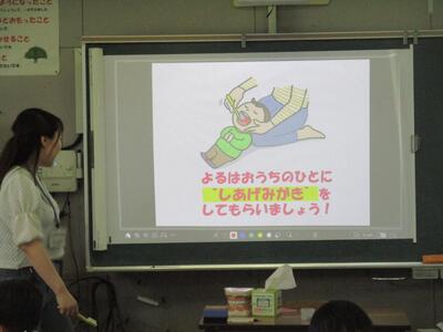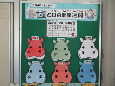 保健室前には、今年も歯科検診の結果が掲示され、歯科受診をよびかけるメッセージが書かれています。手作りの掲示物に、子どもたちもよく見ています。私の小学生の頃の夏休みの思い出の一つは、歯医者さん通いです。祖母に連れられバスにのって玉名市内の歯科医に通いました。終わったらご褒美にお土産を買ってもらえたのが嬉しかったから覚えているのでしょうね。お口の健康は、身体の健康につながっています。他の病気と違い、虫歯は薬を飲んでも寝ていても治りません。ぜひ、時間を見つけて虫歯治療に連れて行ってください。お願いします。