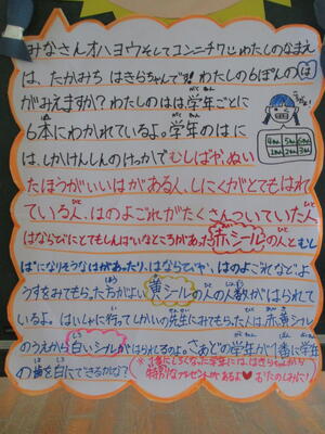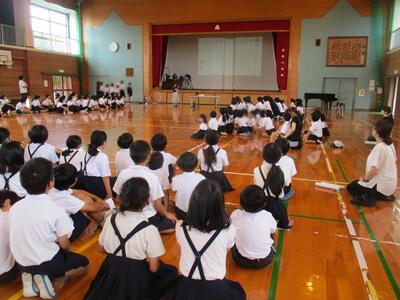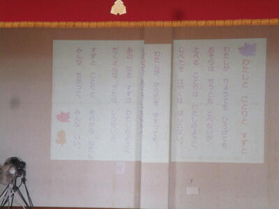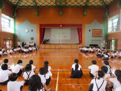 3校時、1年生から6年生までみんなで体育館に集まり、なかまになろう集会をしました。「他の学年の人とも仲良くなりましょう」と運営委員会さんの開会の言葉で集会がスタート。はじめに、市田先生から金子みすずさんの「私と小鳥と鈴と」の詩が紹介され、この詩にどんな思いが込められているかを考えました。「どの花みてもきれいだな」の歌詞のチューリップも歌いました。今年の高道小なかよし宣言が発表され、各学年からなかよし宣言が披露されました。それぞれの学年がどんなことを大切にしたいと考えているかを知ることができました。