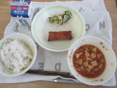 今日の給食は「麻婆豆腐、春巻き、かみかみなます」でした。多くの子どもたちが、ご飯の上に麻婆豆腐をのせて食べていました。春巻きもカリッとした食感で美味しかったです。