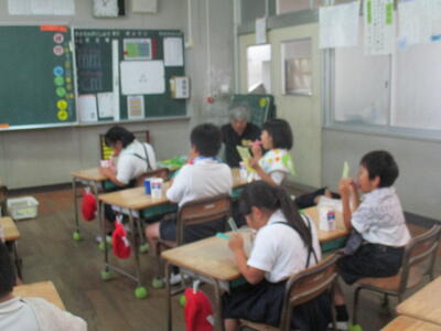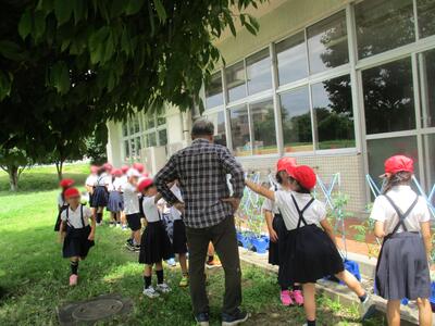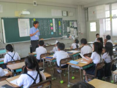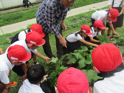 夏野菜づくりに挑戦している2年生たち。今日も名人、森尾さんに来ていただきま、ピーマンの苗植えやオクラの花の付き方、トマトの手入れ等を教えてもらいました。名人さんの手の動きを真剣な目で見つめ、食い入るようにお話を聴く2年生たち。優しくていねいに教えてくださるので、子どもたちもどんどん質問していました。これまでに野菜の生育にあわせて支柱をたてたり、虫除けの木酢液をわけてくださったり、今日もワラをたくさん持ってきてくださいました。おかげで、子どもたちは野菜の生長を間近で見ることができ、楽しみにお世話をすることができています。森尾さん、いつもありがとうございます。