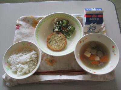 今日の給食のおかずは「とりごぼう汁、大豆と豆腐のフライ、甘酢あえ」でした。野菜の甘酢和えはさっぱりしていて、暑い夏にぴったりでした。