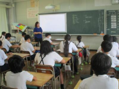 「水の事故はあなたの身近で起きています」「小中学生の水の事故は、1年間に200回以上発生」の見出しのついた写真を見せて、どこが危険なのかを考えるところからスタートした5時間目。今日はB&Gから2人、岱明防災センターから1人の講師の先生方を招いて、4年生が水辺の安全教室に参加しました。