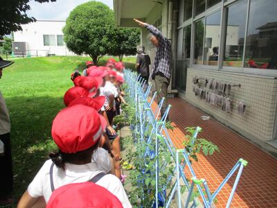 2年生に野菜づくりを教えてくださっている森尾さんが早朝からおいでになり、畑の手入れをしてくださいました。おかげで、夏野菜たちがぐんぐん育っています。時間を見つけてはきてくだっさっていて、ありがとうございます。