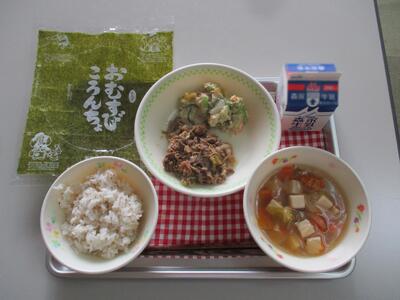 今日の給食は「ワカメご飯、かき玉汁、がんもどきと野菜の含め煮」でした。子どもたちに人気のワカメご飯。暑さを吹き飛ばす、しっかり味のご飯とおかずでした。