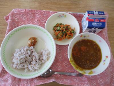 今日の給食は「そぼろ丼、肉団子スープ、ナムル」でした。ご飯に混ぜて食べることができる丼ものは、子どもたちが好きなメニューの一つです。ナムルもさっぱりとして美味しかったです。
