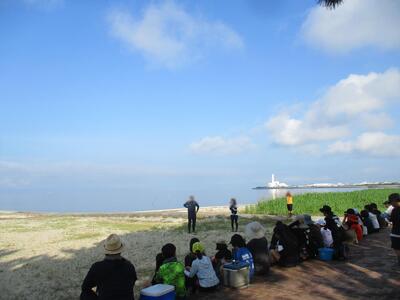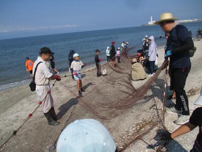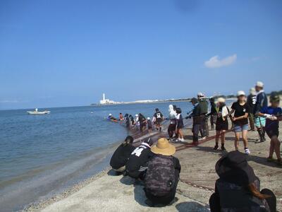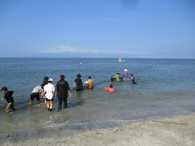 梅雨明けの夏空が広がるなか、予定通りPTA親子ふれあいデー地引き網が実施されました。今回は、地引き網保存会の植田さんをはじめ、会の皆さんにご指導をいただきながら、実際に網を引く、魚を捕る体験をすることができました。