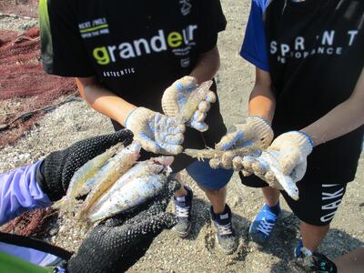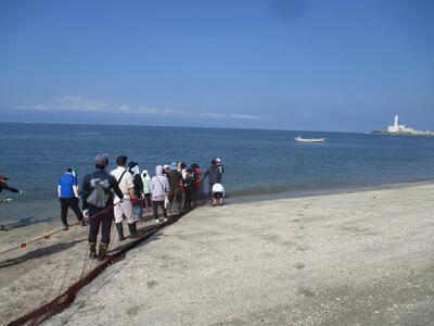 網の長さは1キロメートルもあるそうで、ひいてもひいても続く作業にみんな汗だくになりました。子どもたちは海の中に入って網を引っ張ったり泳いだり、海を楽しんでいました。最後、波打ち際まで網を引き上げると、たくさんの魚たちが網にかかっていました。海岸すぐにこんなにたくさんの魚がいるのかと驚きました。小魚もたくさん!エビやカニもいて、みんな大喜びでした。海の豊かさを満喫できた2時間でした。