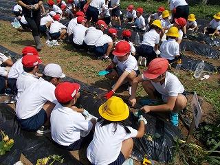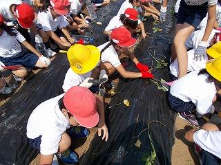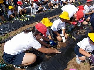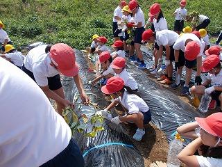 6年生は1年生に優しく芋の植え方を教えてあげていました。