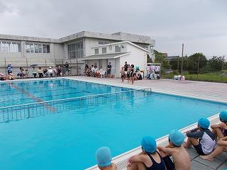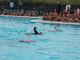 6年生が模範泳法を見せてくれました。クロールや平泳ぎ、さらにバタフライを泳ぐ子もいました。昨年の玉名市の水泳記録会に出場した6年生のクロールのスピードに、子どもたちから歓声があがりました。