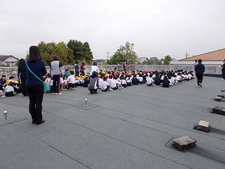 高道小の運動場へ集合後、津波が発生した場合に備え、高道小の屋上へ向かいました。