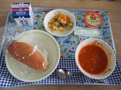 今日の給食のおかずは「かぼちゃポタージュ、鶏肉のマーマレード焼き、キャベツのサラダ」でした。週に1度のパンの日。ほかほかのポタージュで体の中もあたたまりました。