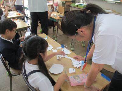 2年生たちが紙版画に挑戦!地域学校協働活動推進員の西村さんにポイントを教えてもらい、まずは、自分の顔をつくるところから始めました。これまでクレヨンや絵の具で描くことはたくさんしてきましたが、紙を重ねて凹凸を作って表現する経験はあまりないので、試行錯誤を繰り返しました。やってみてわかることがたくさんありますね!!