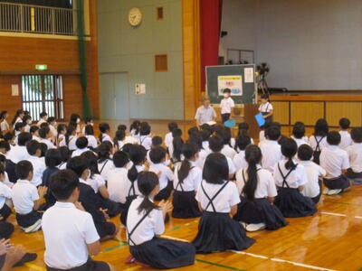 その後、前期の振り返りと後期のめあてについて、1,2年生の代表の人が発表をしました。前期の振り返りをもとに、自分の力で問題を解くことや給食を残さず食べることなど、自分の言葉でしっかり発表できて素晴らしかったです。その後の校歌斉唱も、はつらつとしたいい声が出ました。一人一人後期のめあてを立て、みんなでがんばっていきたいと思います。