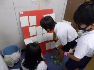 たわしで壁をこすったり、汚れた水を集めたりと、みんな協力して取り組みました。