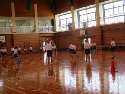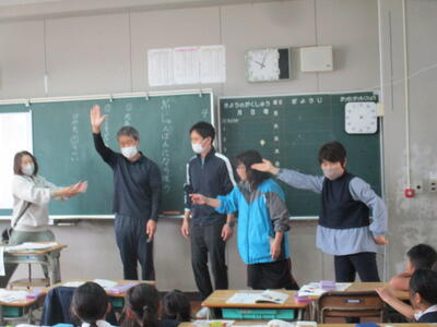 1年生たちは、教頭先生に体育を教えてもらいました。体をしっかり伸ばす柔軟運動や、全身を使ったじゃんけんゲーム。最後は、折り返しリレーで思いっきり走りました。おなかが空いての給食は、とても美味しかったようです。子どもたちに人気のパンの日でした。