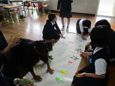 金曜日は、シェイ先生との英語の授業の日。3年生たちは初めての外国語活動の授業でした。興味津々にテキストを見ていました。どのページも楽しそうです。5,6年生は、図工の時間にデザイン画を描いたり、手形を作ったりして創作活動を楽しみました。