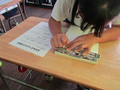その後、点字体験ということで、点字をうつ器具をお借りして、点字を打つ練習をして自分の名前を打つことに挑戦しました。できたら長尾さんに読んでもらい、自分の名前だと正確に点字が打てたということになります。みんな真剣に取り組み、長尾さんに読んでもらうと「よかった~」「ありがとうございます」とホッとした笑顔がひろがりました。