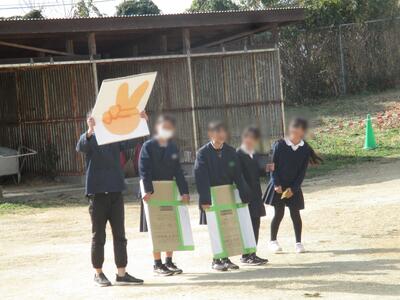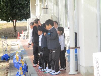 1月も下旬を迎えました。冷たい北風が吹く中でも感染症予防のために換気をしようと伝えるために、保健委員会さんが休み時間に「換気じゃんけん」をしています。写真は南校舎にいる1,2年生に向かって、じゃんけんカードを出しているところです。みんなの意識を高める楽しい取組をありがとう!