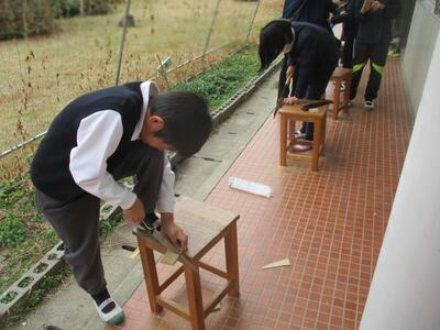 今週は、図画工作の時間にカッターや金づち、のこぎりなどの道具を使った工作に取り組む学年がたくさんありました。普段あまり手にすることのない道具のため、使い方の説明を聞いて使い始めても、なかなか難しそうでした。でも、だから楽しいのです。少しがんばればできそうなことだから、子どもたちは「やるぞ」という意欲がわいてきます。何事も経験。出来上がりが楽しみですね。