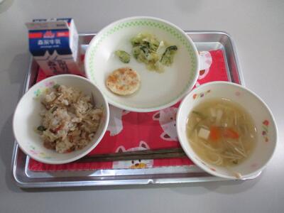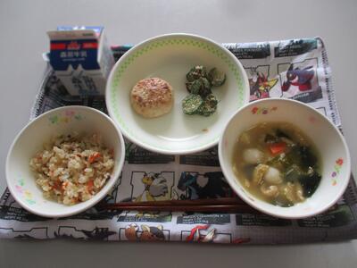 今日の給食は「南関あげご飯、ふし素麺汁、豆腐のふわふわ焼き、キャベツの胡麻酢あえ」でした。玉名の味、南関町の特産物がたくさん。味ごはんにそうめん入りの汁物で、みんな大喜びでした。
