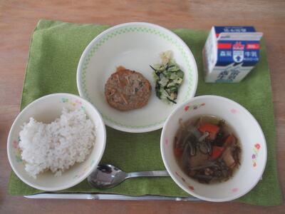 今日の給食は「もずくスープ、いわしハンバーグのおろしソースがけ、ひじきと豆のサラダ」でした。まごわやさしい献立です。豆・ごま・わかめなどの海藻類・野菜・魚・しいたけなどのキノコ類・いも・・・気づきましたか?