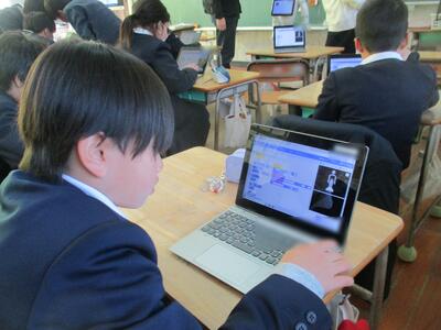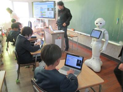 先週から1週間、玉名市教育委員会からペッパーくんが高道小に来てくれました。4年生たちは、自分が考えた動きをペッパーくんにしてもらおうと、プログラミングを使って懸命に考えていました。右を向くのも手を上げるのも、一つ一つ指示を組み立てていかないと動きません。論理的に思考すること(プログラミング的思考)のよい勉強です。4年生のみなさん、手ごたえはいかがでしたか?