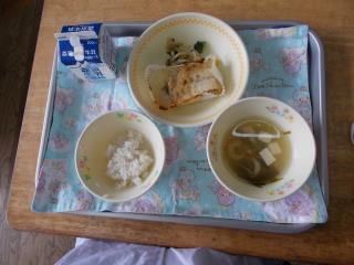 メニューは、麦ご飯、豆腐のすまし汁、魚の黄金焼き、きのこと野菜の和え物